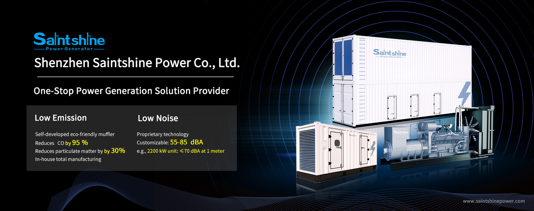 Shenzhen Saintshine Power Co., Ltd. provides reliable power solutions, with diesel generators ranging from 8kW to 3000kW and gas generators from 30kW to 4.5MW. Low noise(55-85dBA); Low emission(reduce co by 95%).
